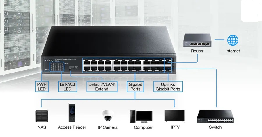 Với 24 cổng LAN Gigabit, Cudy GS1024 mang đến khả năng mở rộng mạng một cách linh hoạt, giúp kết nối đa dạng thiết bị như máy tính, máy in, camera IP. Băng thông 48Gbps đảm bảo truyền tải dữ liệu mượt mà của nhiều thiết bị cùng lúc trong hệ thống mạng Wi-Fi tốc độ cao hoặc hệ thống IP camera.2 cổng Gigabit RJ45 Uplink (23 và 24) dùng mở rộng quy mô hệ thống mạng, đảm bảo dữ liệu được truyền tải một cách nhanh chóng. Với ưu thế về tốc độ và độ tin cậy, cổng Uplink thường được sử dụng để kết nối giữa các switch, router với nhau, tạo nên một hệ thống mạng quy mô hơn, tăng khả năng kết nối giữa các thiết bị trong hệ thống.